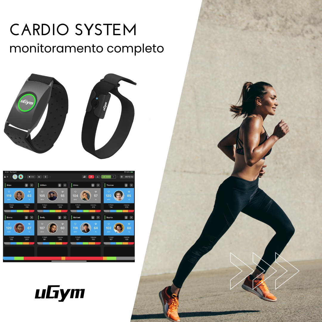 O Cardio System é ideal para aulas de Crossfit, HIIT, Bootcamp, Funcional, Danças e outras atividades coletivas. Ele oferece recursos como monitoramento de BPM, calorias, watts, frequência cardíaca, intensidade, montagem de aulas, competições entre equipes e análises completas dos dados no final.