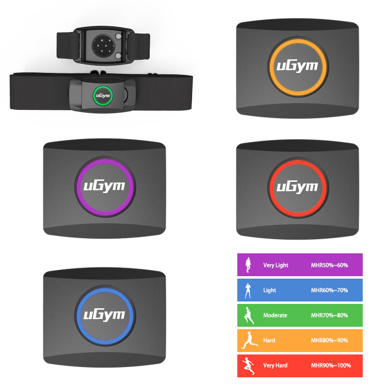 Monitor de Frequência Cardíaca com Detecção Dual-mode PPG/ECG ANT+/BLE UCS808. Compatível com Bluetooth 5.0 e ANT+, oferece dados precisos para gerenciar a intensidade do exercício. Principais recursos incluem contagem de passos, calorias queimadas, lembrete de vibração e indicador LED. Bateria recarregável com até 60 horas de uso contínuo. Resistente à água (IP67) e compatível com nosso app uGym FitControl, uGyn FitHome e apps como X-fitness, Wahoo, Zwift, Runtastic Pro e Nike Run Club.